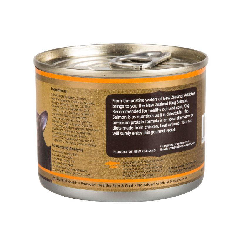 King Salmon, Hoki, Potatoes, Carrots, Peas, Carrageenan, Cassi Gums, Salt, Oranges, Lemons, Taurine, Choline Chloride, Calcium Carbonate, Zinc Sulphate, Ferrous Sulphate, Vitamin E Supplement, Niacin Supplement, Thiamine Mononitrate, Manganese Sulphate, Copper Sulphate, Calcium Pantothenate, Sodium Selenite, Riboflavin Supplement, Vitamin A Supplement, Pyridoxine Hydrochloride, Biotin, Vitamin B12 Supplement, Vitamin D3 Supplement, Folic Acid, Calcium Iodate.