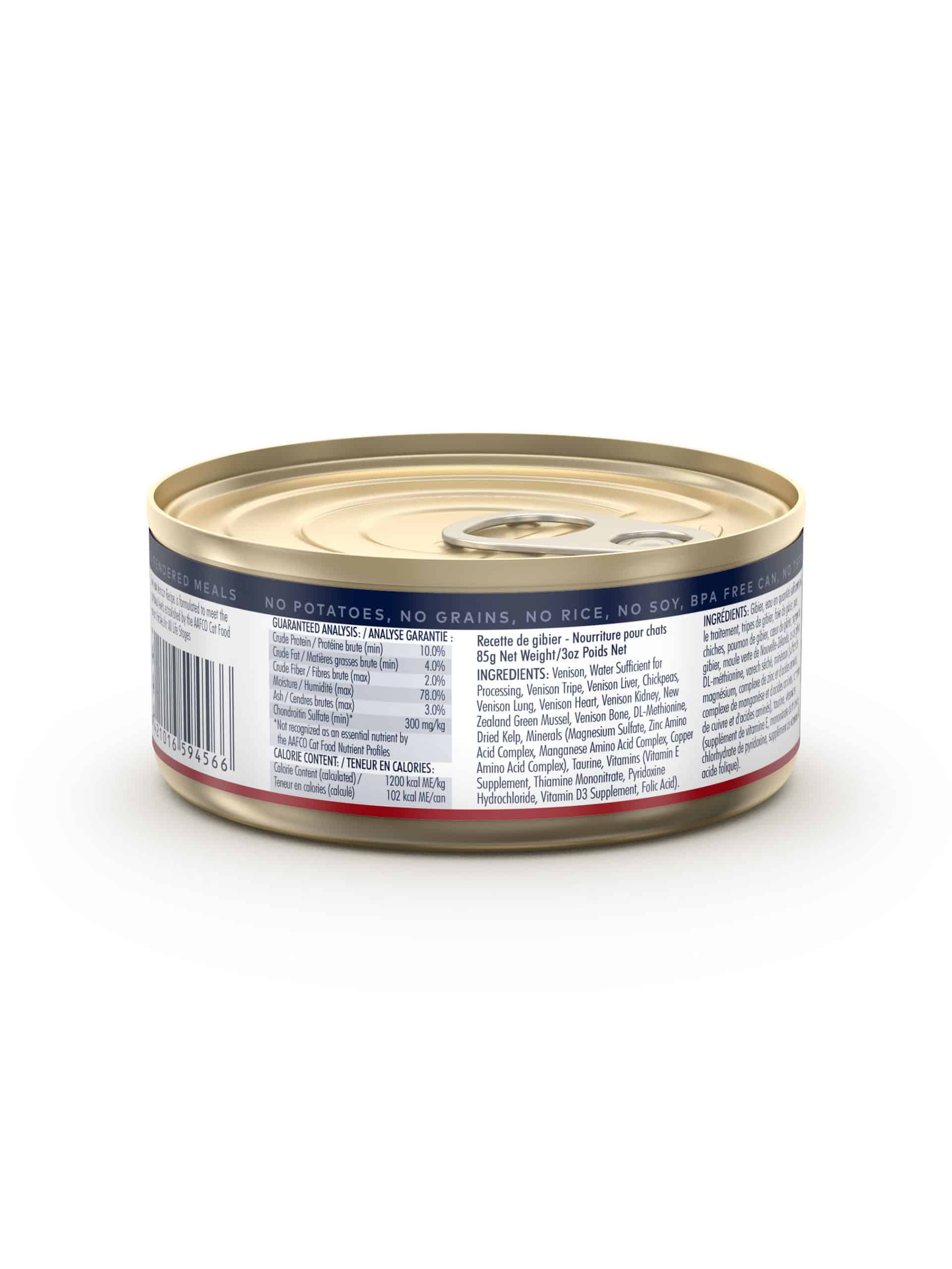 Venison, Water Sufficient for Processing, Venison Tripe, Venison Liver, Chickpeas, Venison Lung, Venison Heart, Venison Kidney, New Zealand Green Mussel, Venison Bone, DL-Methionine, Dried Kelp, Minerals (Magnesium Sulfate, Zinc Amino Acid Complex, Manganese Amino Acid Complex, Copper Amino Acid Complex), Taurine, Vitamins (Vitamin E Supplement, Thiamine Mononitrate, Pyridoxine Hydrochloride, Vitamin D3 Supplement, Folic Acid).
