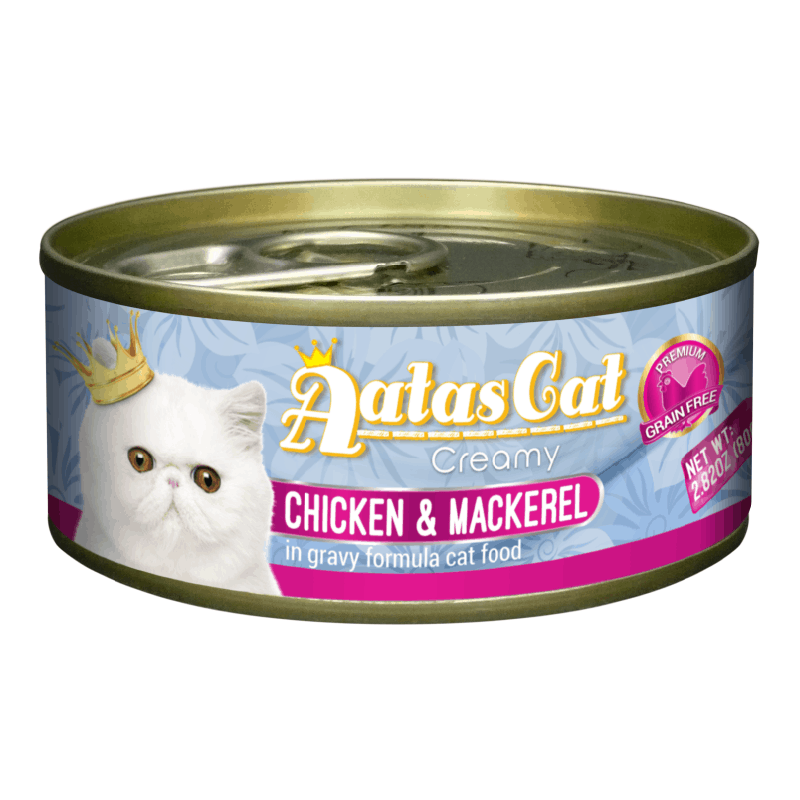 Aatas Cat canned food is a great way to add some variety to your cat’s diet, in addition to providing an alternate source of water for healthy hydration! A perfect blend of creamy free-range Chicken with wild caught Mackerel, cooked and simmered in a delicious gravy. Savor the delectable shreds of slow-cooked Chicken, topped with pieces of succulent Mackerel in rich gravy.Â