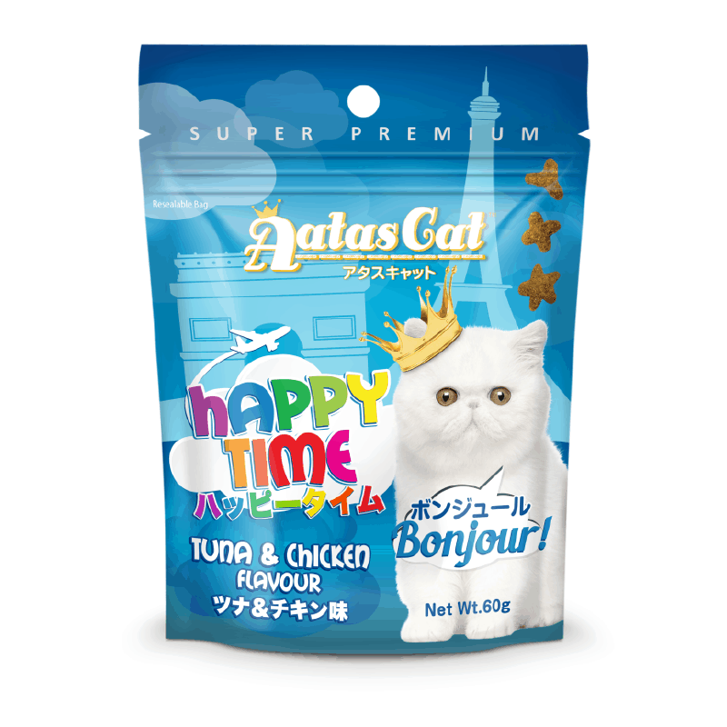 Happy Time Bonjour! – Tuna & Chicken is packed with irresistible savoury flavours and loaded with essential vitamins & minerals in a pocket-sized resealable bag. Prepared with the perfect combination of Tuna & Chicken for a superior flavour that even the finickiest cat will crave. Happy Time is the perfect choice of treat for owners who want to indulge their cats while ensuring that their nutritional needs are well taken care of.
