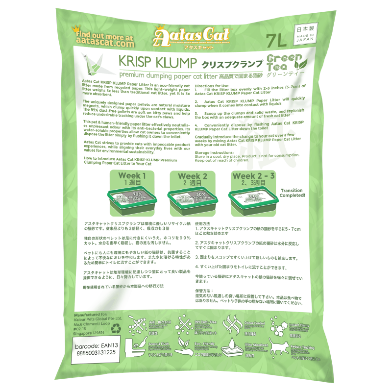 Aatas Cat KRISP KLUMP Paper Litter is an eco-friendly cat litter made from recycled paper. This light-weight paper litter weighs 3x less than traditional cat litter, yet it is 3x more absorbent.