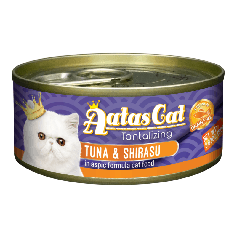 Aatas Cat canned food is a great way to introduce variety to your cat’s diet, in addition to providing an alternate source of water for healthy hydration! A perfect blend of tantalizing wild caught Tuna with savory Shirasu, cooked and simmered in delicious savory aspic. Savor the delectable freshness of Tuna, caught in an environmental-friendly way, and topped with pieces of slow-cooked Shirasu.