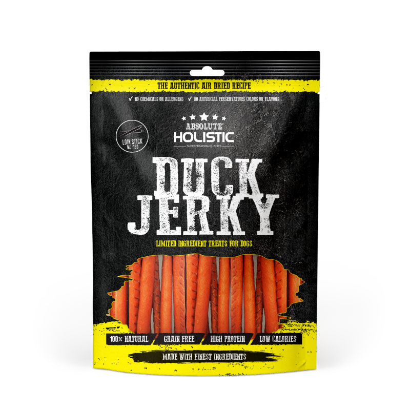 Absolute Holistic Grain-Free Duck Loin Strip is a tasty dog treat. Made with real duck meat and sweet potato, this is a great snack for any time of the day. This treat is also free of any chicken or chicken by-products so it is suitable for chicken sensitive dogs. These jerky treats are made with lean cuts of wholesome meats, slowly flame-grilled to lock in the rich flavours and authentic aromas. They are also made in small batches and oven-dried to maximise the uniquely moist texture. It is also 100% grain-free and does not contain any chemicals, allergens, artificial flavours, colours or preservatives. The slightly smoky flavour in the treats will have your dog reaching into the bag for another piece. Mouth-watering, satisfying and astonishingly tender jerky will go far beyond your expectations, you’ll never settle for another jerky again.