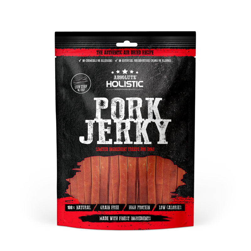 You know your dog will love this treat, just look at how much he is savouring it till the very last bite. Absolute Holistic Pork Loin Dog Treat is made with real deboned pork meat. Each strip is guaranteed tasty and satisfying for your pup to enjoy. This treat is also free of any chicken or chicken by-products so it is suitable for chicken sensitive dogs. These jerky treats are made with lean cuts of wholesome meats, slowly flame-grilled to lock in the rich flavours and authentic aromas. They are also made in small batches and oven-dried to maximise the uniquely moist texture. It is also 100% grain-free and does not contain any chemicals, allergens, artificial flavours, colours or preservatives. The slightly smoky flavour in the treats will have your dog reaching into the bag for another piece. Mouth-watering, satisfying and astonishingly tender jerky will go far beyond your expectations, you’ll never settle for another jerky again.