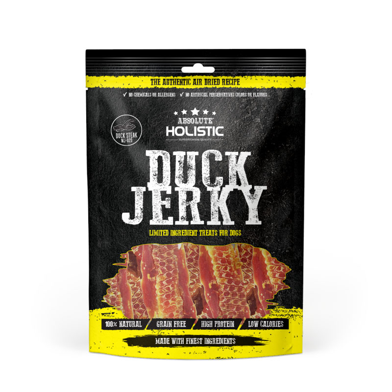You love steaks? So does your dog! The next time you dine on a juicy cut of steak, give a lamb steak treat to your dog too! Absolute Holistic Grain-Free Duck Steak Dog Treat is great for training or rewarding. It is made with real, savoury cuts of duck meat that is tender and delicious. This treat is also free of any chicken or chicken by-products so it is suitable for chicken sensitive dogs. These jerky treats are made with lean cuts of wholesome meats, slowly flame-grilled to lock in the rich flavours and authentic aromas. They are also made in small batches and oven-dried to maximise the uniquely moist texture. It is also 100% grain-free and does not contain any chemicals, allergens, artificial flavours, colours or preservatives. The slightly smoky flavour in the treats will have your dog reaching into the bag for another piece. Mouth-watering, satisfying and astonishingly tender jerky will go far beyond your expectations, you’ll never settle for other jerky again.