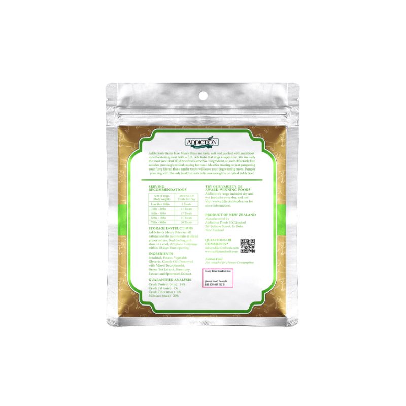 Each tasty bite satisfies your dog’s natural craving for meat, making it a great way to train or pamper your dog. Moist, soft and succulent in texture, these dog treats are completely grain-free and hypoallergenic and made with the finest natural ingredients. Truly, Addiction Meaty Bites are healthy dog treats delicious enough to be called “Addiction”!