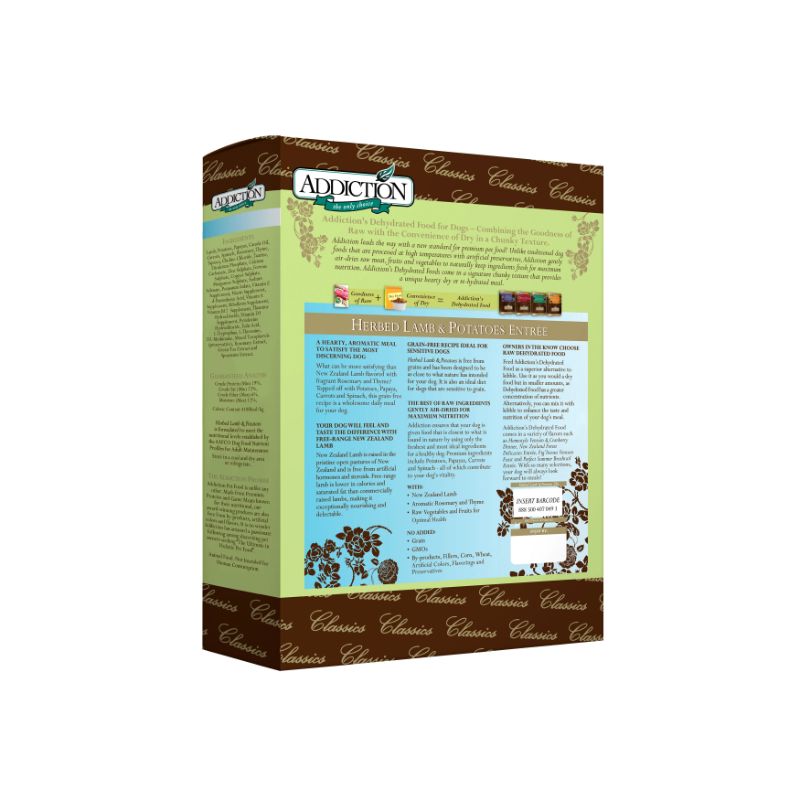 Made with prime free-range lamb flavored with fragrant rosemary and thyme and topped off with spinach, potatoes and carrots, all sourced from New Zealand—the purest place on earth to source and produce pet food. All natural with added vitamins and minerals for a balanced diet, the holistic formula of Addiction Herbed Lamb is high in protein but low in cholesterol and fat.