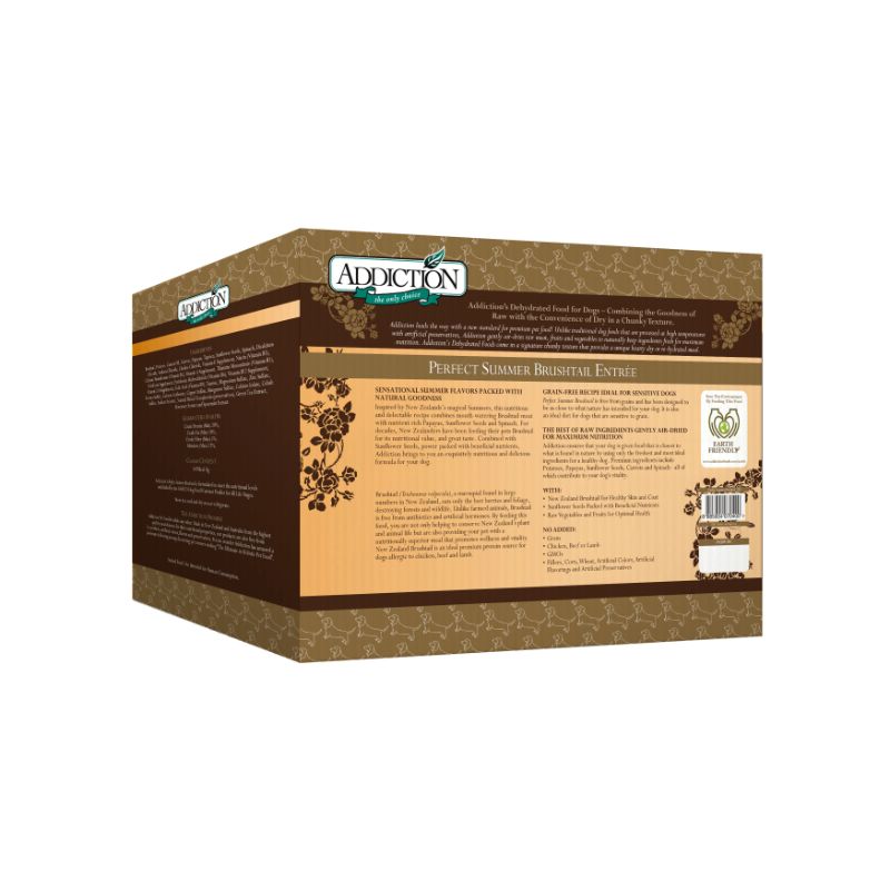 Add 1 part of Addiction Perfect Summer Brushtail Entrée with 1 part of warm water. Add less water if thicker consistency is desired and stir well before serving. You need not wait for all the water to be absorbed. Once rehydrated, consume within 4 hours. Alternatively, you can feed Addiction Perfect Summer Brushtail Entrée dry without rehydration. Keep fresh water available at all times. Adjust feeding level to your dog’s individual needs. Puppies may consume up to 2.5 times of the recommended amount per day stated above. Pregnant / Nursing Dogs may consume up to 2.75 times of the recommended amount per day stated above.