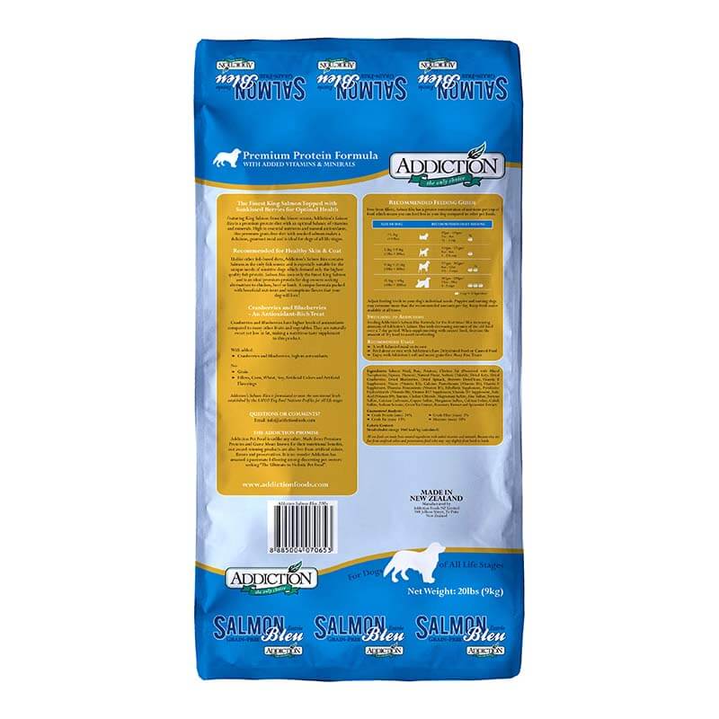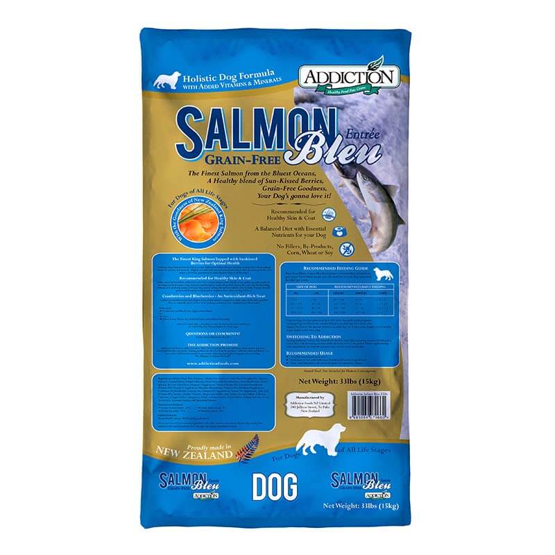 We go further for pets when it comes to their overall well-being. That’s why Addiction Foods gives you Addiction Grain-Free Salmon Bleu Dry Dog Food Formula. Rated Best Choice for Safety & Sustainability by the Monterey Bay Aquarium’s Seafood Watch, it is packed with the finest king salmon from the bluest of waters in New Zealand—the purest place on earth to source and produce pet food.