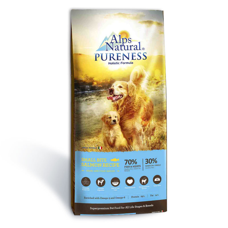 Fish (fresh salmon min 5%), Grain (rice min 5%), Meat and Derivatives, Oils and Fats, Beet Pulp, FOS (fructo oligo sachharide), Yucca Schidigera, Vitamin and Mineral Substances