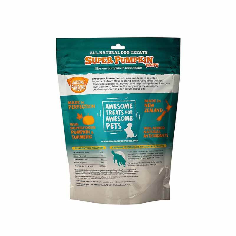 Awesome Pawsomeâ„¢ Super Pumpkin is the premium vegan treat for discerning pets. Made with real pumpkin and rich in antioxidants, it is the ideal snack for pets with meat protein allergies.