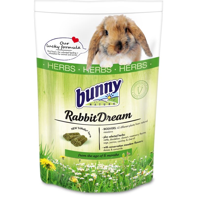 Fill the feeding bowl with RabbitDream HERBS and wait until all the food has been eaten, before refilling it again. Give high quality bunny hay and fresh, lukewarm water daily. At the age of 6 years change to RabbitDream SENIOR.