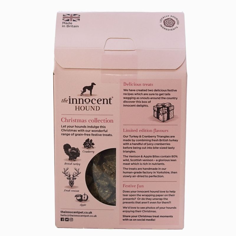 We have created two delicious festive recipes which are sure to get tails wagging, as snouts around the country discover this box of innocent delights. The Christmas Treat Collection contains two exclusively made treats, including a sumptuous Venison & Apple Bites, and a Turkey Triangles with sweet whole cranberries. Packed into a beautifully presented festive box, this collection would make a paw-fect gift for any hound lovers.