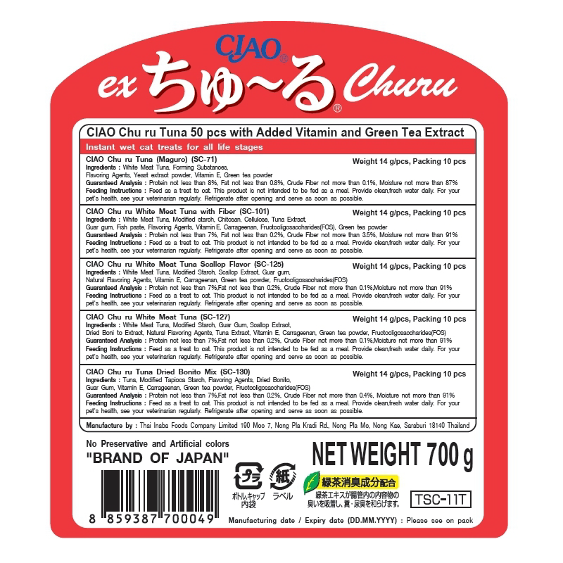 White meat tuna, starch, scallop extract, guar gum, natural flavouring agents, Vitamin E, Carrageenan, Green tea powder, fructooligosaccharide (FOS).