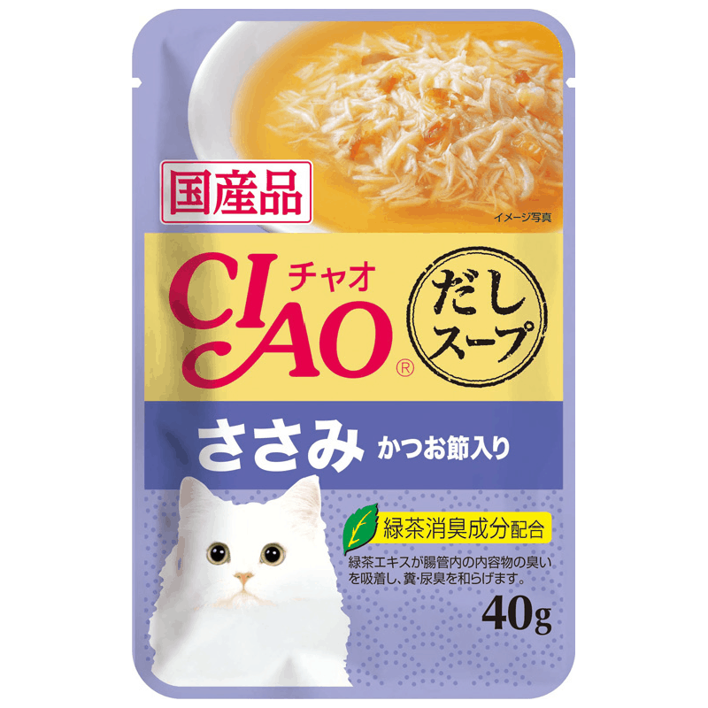 HomeCatsFoodWet Food CIAO Clear Soup Pouch – Chicken Fillet Topping Dried Bonito 40g
