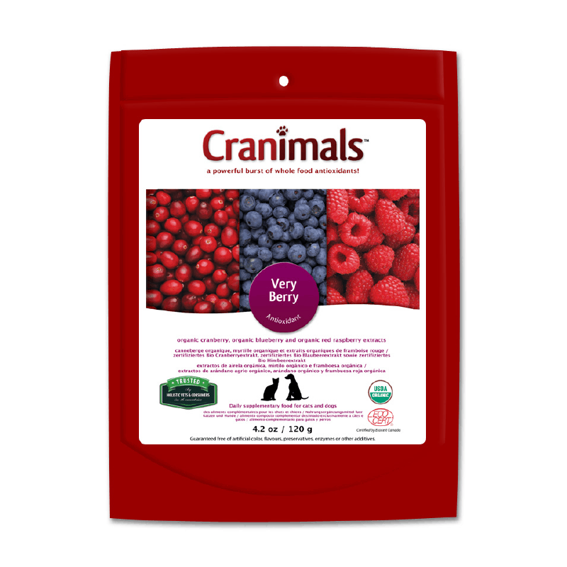 CRANIMALSâ„¢ VERY BERRY is made from certified organic blueberries, cranberries, and red raspberries, three of the world’s healthiest fruits. Scientific studies show that the polyphenols in these berries have anti-carcinogenic, anti-angiogenic, anti-inflammatory, anti-bacterial, and anti-viral properties. Anthocyanidins found in cranberries and blueberries naturally support urinary tract and oral health in companion animals. Red raspberries are particularly enriched in ellagitannins, compounds demonstrated to destroy various cancer cells. CRANIMALSâ„¢ VERY BERRY delivers a synergistic combination of antioxidants, to help mop up harmful oxidants called free radicals, which damage cells, tissues and arteries, leading to chronic disease. CRANIMALSâ„¢ VERY BERRY can be easily added to your pet’s daily diet for a powerful burst of extra antioxidants!