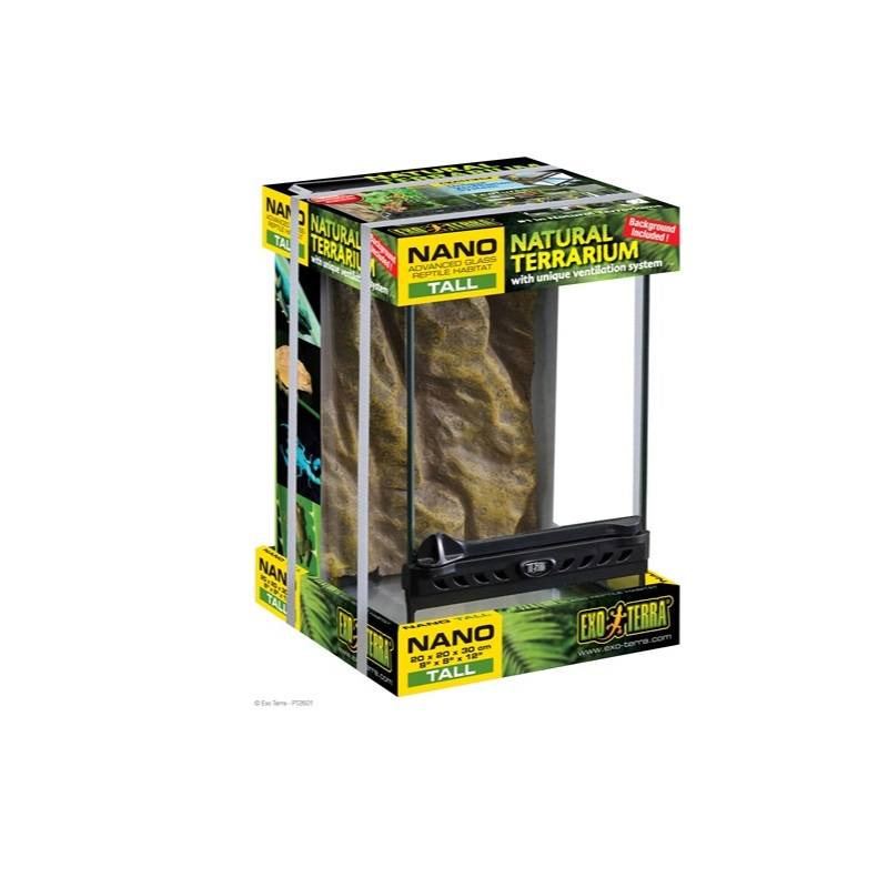 The Exo Terra Glass Terrarium is the ideal reptile or amphibian housing designed by European herpetologists. The front opening doors allow easy access for maintenance and feeding. A specially designed lock will prevent escape and the doors can be opened separately. The full screen top ventilation allows UVB and infrared penetration, and is completely removable for easy access while decorating or cleaning. In the back of the screen cover are 5 closable wire or tube inlets on both sides to install Heat Wave Rocks, Waterfalls, sensors, etc. inside the terrarium. The bottom plate of the terrarium is raised to mount a substrate heater to heat a part of the extended ground surface. The extra high fixed front window is ideal for thick layers of substrates (burrowing reptiles), aquatic parts (paludarium) or to mount an Exo Terra reptile den. The natural background is in the same colour like all other Exo Terra decoration items (Water Dishes, Waterfalls, Heat Wave Rocks, etc.) and provides an extra climbing dimension.