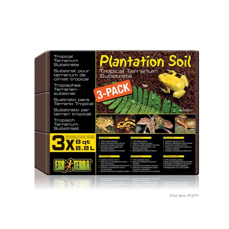Exo Terra Plantation Soil is made from compressed coconut husk fibre from the plantations of tropical Asia. This ecological substrate is ideal for increasing humidity in the terrarium and is totally safe for frogs, salamanders and burrowing or digging animals. The substrate can also be used as an incubation medium because of its hygroscopic properties. This 100% natural substrate can even be used as a nutritional planting soil for live plants in a terrarium set-up.