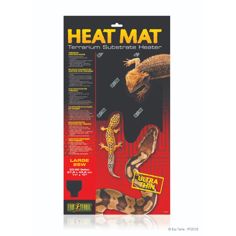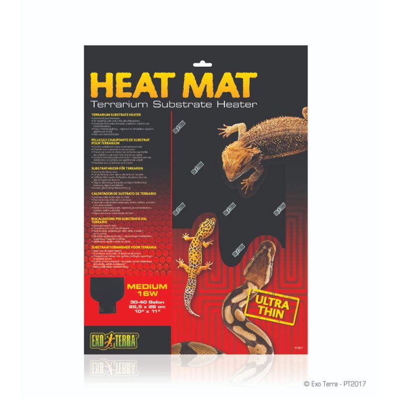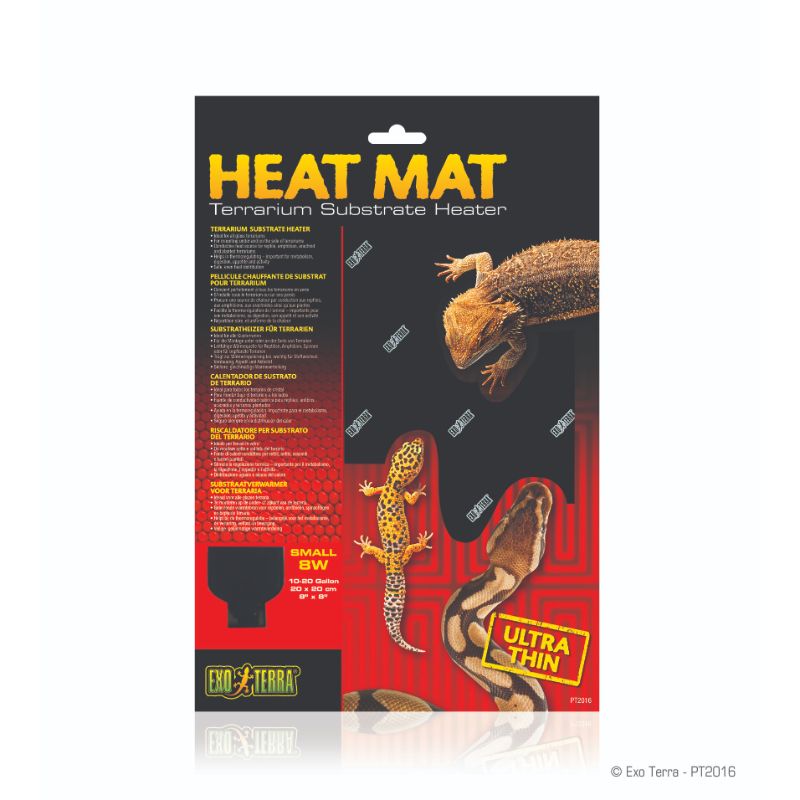 Reptiles and amphibians are cold-blooded and in their natural habitat they often use surfaces heated by the sun to warm up. The Exo Terra Heat Mat is a terrarium substrate heater that simulates these surfaces heated by the sun. Exo Terra’s Heat Mats are an ideal 24-hour primary or secondary heat source for tropical or temperate reptile and amphibian species and essential as a nighttime heat source for many desert species. The Exo Terra Heat Mat permanently adheres to the terrarium, forming a solid bond for optimal heat transfer. Can be used with an Exo Terra Thermostat and/or in conjunction with additional heat sources for higher temperature species.