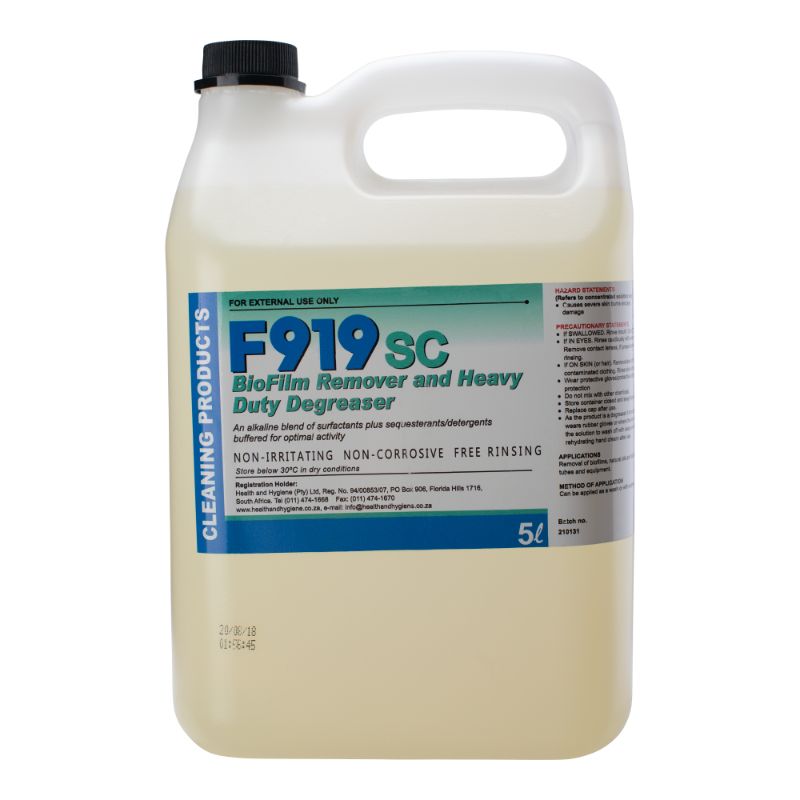 F919SC Degreaser/cleanser is an alkaline heavy-duty cleanser with an emulsifying action for removing heavy soiling, protein, fat and natural oil deposits from hard surfaces safely. Regular use will also prevent the formation of biofilm. Its mechanism of action is not reliant upon a mechanical brushing/scrubbing action, but interacts chemically with the organic film to release it from the surface.