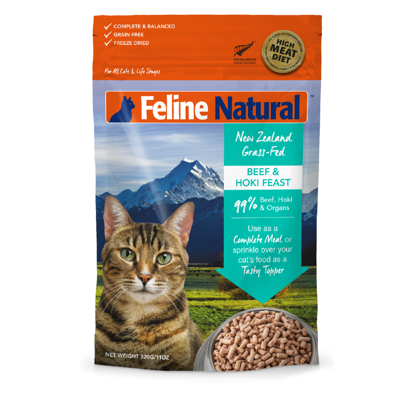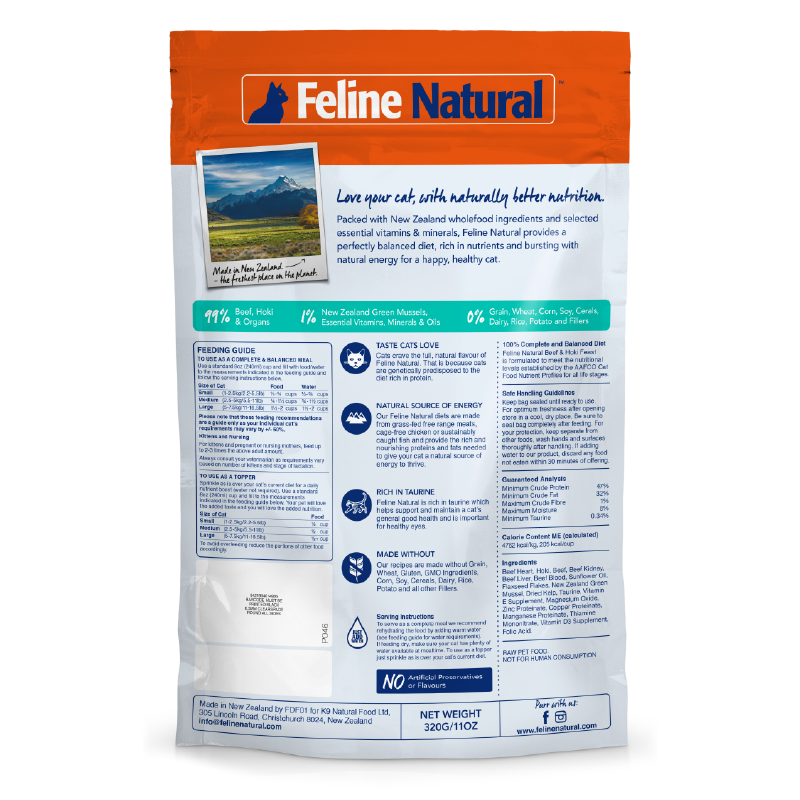 Feed your cat pure goodness with the Feline Natural Beef & Hoki Feast Grain Free Freeze-Dried Cat Food. Packed with New Zealand wholefood ingredients and selected essential vitamins, minerals and oils, it’s perfect as a balanced diet or a nutrient-rich boost to your cat’s existing diet. The recipe is made from 99% grass-fed beef and sustainably caught hoki, offering your kitty all the high meat nutrition that he loves and craves. And thanks to the innovative freeze-drying process, only the water is gently removed, preserving all the great taste and nutrition that supplies natural energy.