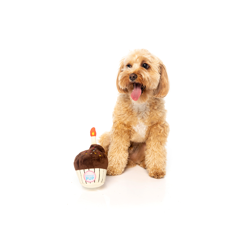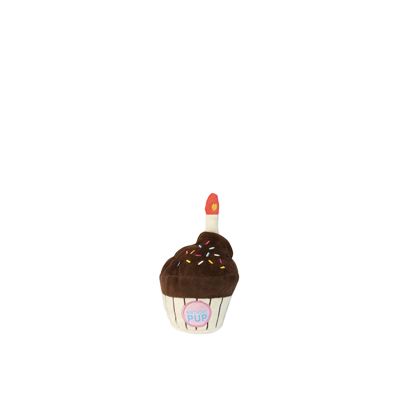 Topped with chocolate icing, sprinkles and a birthday candle, this delectable cupcake will delight any pup!