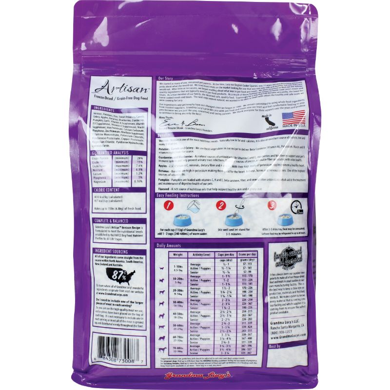 Grandma Lucy’s provides you with pet food and treats you can trust and feel comfortable feeding to your pets and brings you only the best! The foundation for outstanding foods begins with quality ingredients. Grandma Lucy’s recipes consist of only natural, whole food ingredients and never use meat meals, chicken meals, or by-products. This ensures that your pet is getting premium nutrition in every bite! Grandma Lucy’s Artisan Venison Recipe is formulated to meet the nutritional levels established by the AAFCO Dog Food Nutrient Profiles for All Life Stages including growth of large size dogs (70lb or more as an adult).