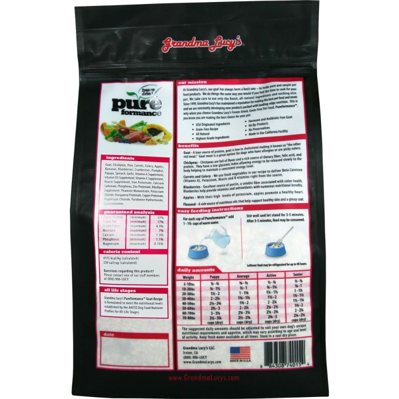 Grandma Lucy’s provides you with pet food and treats you can trust and feel comfortable feeding to your pets and brings you only the best! The foundation for outstanding foods begins with quality ingredients. Grandma Lucy’s recipes consist of only natural, whole food ingredients and never use meat meals, chicken meals, or by-products. This ensures that your pet is getting premium nutrition in every bite! The pureformance formula is accompanied by chickpeas instead of grains. Also known as Garbanzo Beans, Chickpeas are low glycemic legumes that are a great source of protein, folic acid, fiber, and the essential amino acid lysine. Folic Acid is very important for cardiovascular health and is needed for energy production. Fiber is important in aiding proper digestion. Lysine is vital for many body functions including growth and maintenance of tissues and muscle mass. Simple ingredients are used to bring your pet the best simple nutrition.