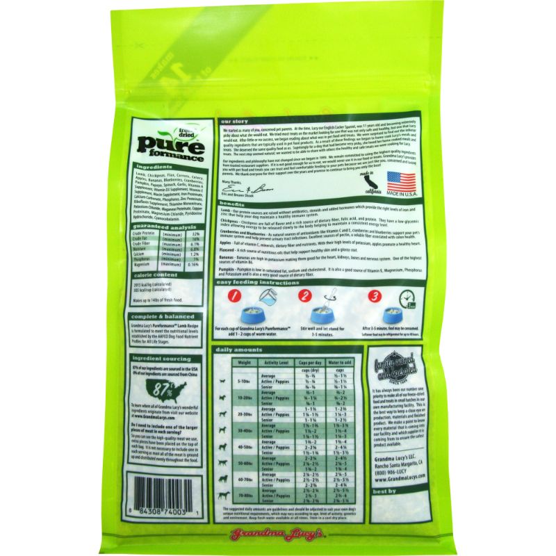 Grandma Lucy’s provides you with pet food and treats you can trust and feel comfortable feeding to your pets and brings you only the best! The foundation for outstanding foods begins with quality ingredients. Grandma Lucy’s recipes consist of only natural, whole food ingredients and never use meat meals, chicken meals, or by-products. This ensures that your pet is getting premium nutrition in every bite! The pureformance formula is accompanied by chickpeas instead of grains- Also known as Garbanzo Beans, Chickpeas are low glycemic legumes that are a great source of protein, folic acid, fiber, and the essential amino acid lysine. Folic Acid is very important for cardiovascular health and is needed for energy production. Fiber is important in aiding proper digestion. Lysine is vital for many body functions including growth and maintenance of tissues and muscle mass. Simple ingredients are used to bring your pet the best simple nutrition.