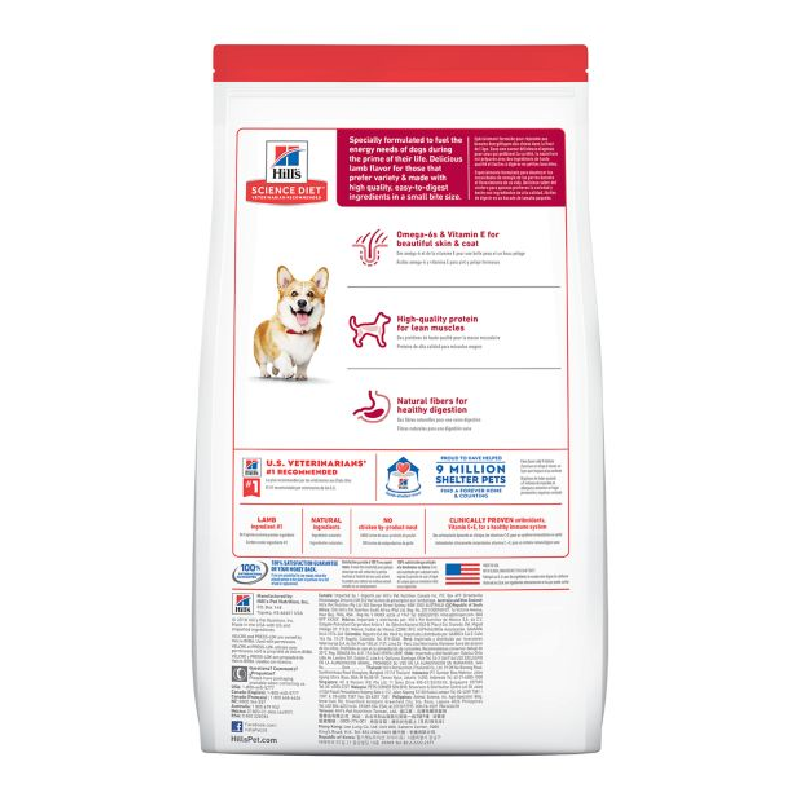 Hill’s® Science Diet® Small Bites Adult dry dog food is specially formulated to fuel the energy needs of dogs during the prime of their life. Delicious lamb flavor for those that prefer variety & made with high quality, easy-to-digest ingredients in a small bite size.