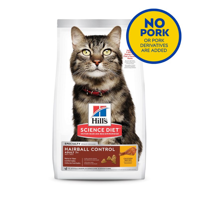 Hill’s™ Science Diet™ Hairball Control Adult 7+ dry cat food provides nutrition to help avoid hairball formation for cats.