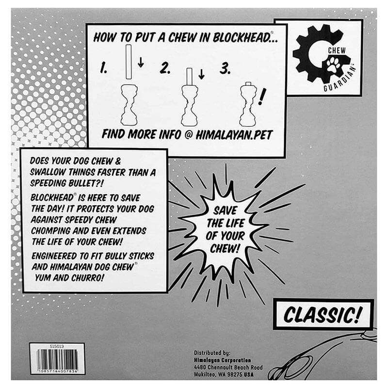 Blockhead is a fun toy that slows down the chewing time on your dog’s favorite chew. It is strong and durable and holds any type of chew, from bully sticks, to apples to peanut butter; while giving your dog plenty of chewing entertainment. It’s easy to use, simply slide the chew in the from the top center of Blockhead to hold it in place. It’s now ready for your dog to enjoy and have fun.