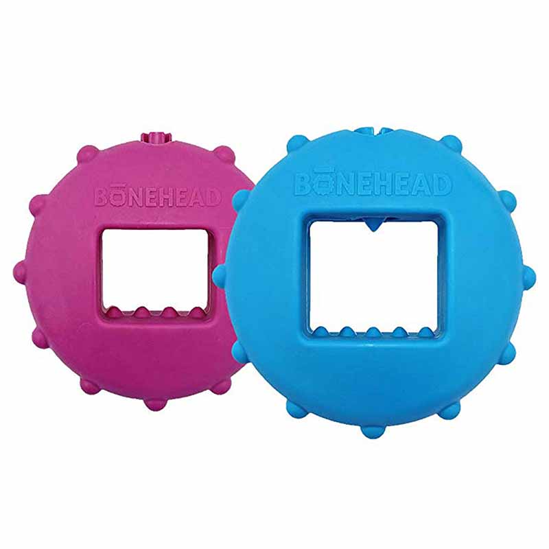 Bonehead® is a chew accessory that is specifically engineered to work with Himalayan Dog Chew®, but it can hold lots of other chews too, from bully sticks to carrots. It’s easy to use, simply use a screwdriver to loosen the screw, slide in a chew so that it’s centered in Bonehead® and tighten the screw back down. Now give it to your dog to enjoy. When they have chewed as much as they can, take Bonehead® back and remove the small piece locked in the middle, soak it in warm water for five minutes, pat it dry and toss it in the microwave for 45 seconds to make a cheesy puff for your pup. Always be sure that you cool microwaved puff for at least two minutes before giving it to your dog. Do not microwave Bonehead®. Available in two size, small & large.