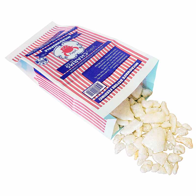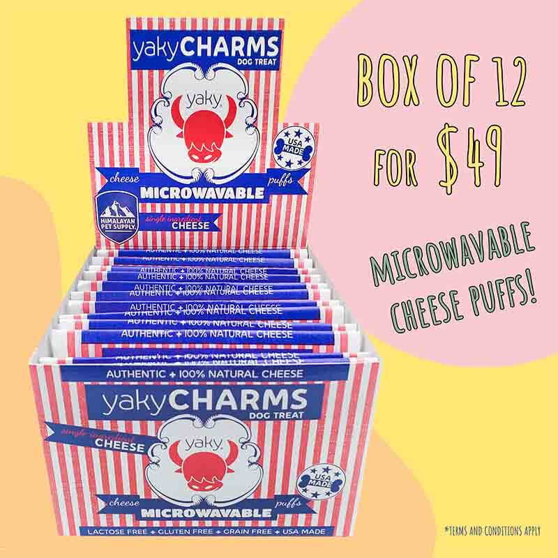Enjoy movie night with your furry BFF! YakyCHARMS are a delightful cheesy snack your dog will love! These bite sized treats are a light, fluffy, microwaveable cheese snack which comes in a popcorn style bag that is fun to make! YakyCHARMS are made with one single ingredient; our Himalayan cheese. It is 100% natural and lactose, gluten and grain free. Microwave on HIGH for 1 minute; time will vary depending on your microwave, (NOTE: never cook YakyCHARMS over 1.5 minutes and never leave microwave unattended.) Bag may not fully inflate when heating is complete. The cheese will not pop; you will not hear a popping sound as you do when you make popcorn. Be careful not to overcook; YakyCHARMS can scorch if overcooked.