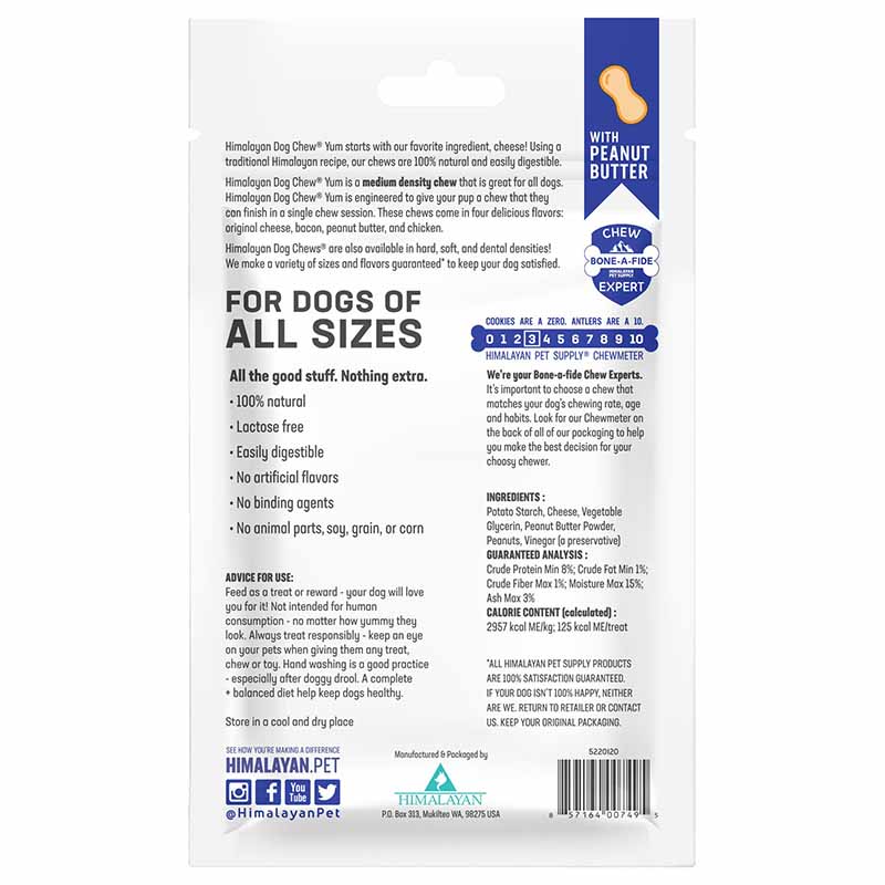 YUM is a medium density cheese chew, great for the everyday chewer. These dense chews support oral health while satisfying your dog’s natural need to chew. YUM is an all-natural, long-lasting chew for all sizes and ages of dogs. Made in Washington State with locally sourced, limited ingredients and with our deeply rooted, traditional Himalayan cheese recipe. YUM is available in 3 tasty flavors; cheese, cheese with peanut butter and cheese with chicken.
