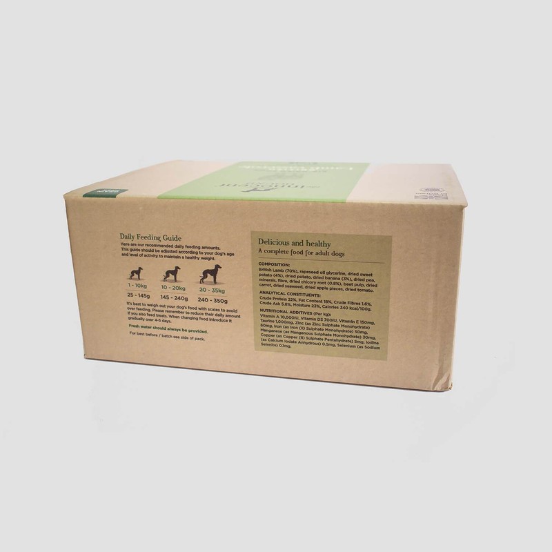 Our award-winning British Lamb Casserole is a single meat protein, grain-free complete food for adult dogs. We use high quality, fresh British lamb which is a highly digestible, meaning more nutrients are absorbed. Our Lamb Casserole contains chicory root, a rich source of prebiotics that helps maintain healthy digestion. Country vegetables and select fruits add flavour as well as being a great source of vitamins and minerals. Our air-dried raw dog food is made using ethically sourced, quality British ingredients and our very own gentle drying expertise. The result is a semi-moist, great tasting, healthy and nutritious feast. The handmade production method means with minimum processing and no high temperatures, the nutrients and flavours of the ingredients are maintained. The food can be stored at room temperature, and once opened the pack lasts for up to 4 months, making it very convenient. When changing food please introduce it gradually over 4-5 days.