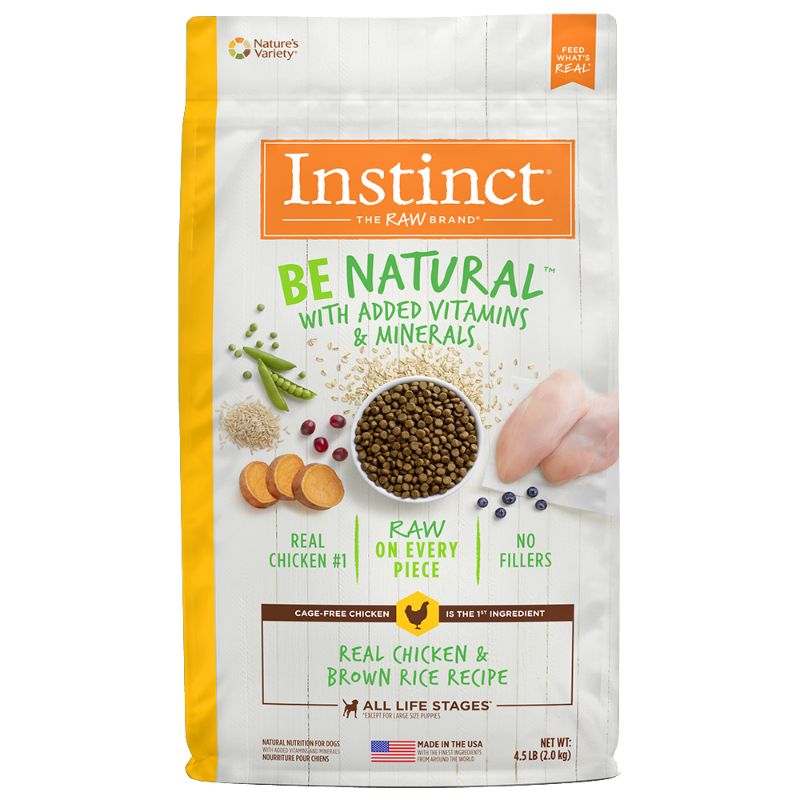 Natural nutrition begins here. Instinct® Be Naturalâ„¢ Real Chicken & Brown Rice Recipe starts with cage-free chicken and never contains filler, corn, wheat, soy or by-product meals or artificial preservatives and colors. Guided by our belief in the power of raw, each piece is tumbled with crushed freeze-dried raw chicken – raising the bar in nutrition and taste.​