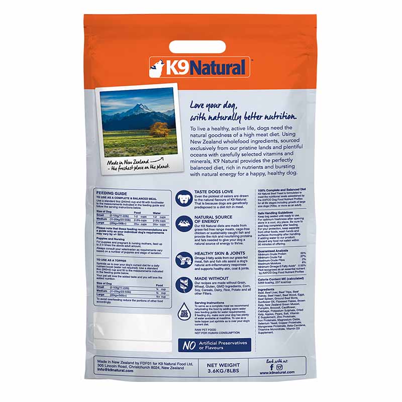 Beef, Beef Liver, Beef Tripe, Beef Kidney, Beef Heart, Beef Blood, *Eggs, Beef Spleen, Ground Beef Bone, Sunflower Oil, Flaxseed Flakes, Brown Kelp, New Zealand Green Mussel, Pumpkin, Broccoli, Cauliflower, Cabbage, Potassium Sulphate, Dried Kelp, Apples, Pears, Salt, Vitamin E Supplement, Zinc Proteinate, Iron Proteinate, Magnesium Oxide, Selenium Yeast, Copper Proteinate, Manganese Proteinate, Beta-Carotene, Thiamine Mononitrate, Vitamin D3 Supplement.