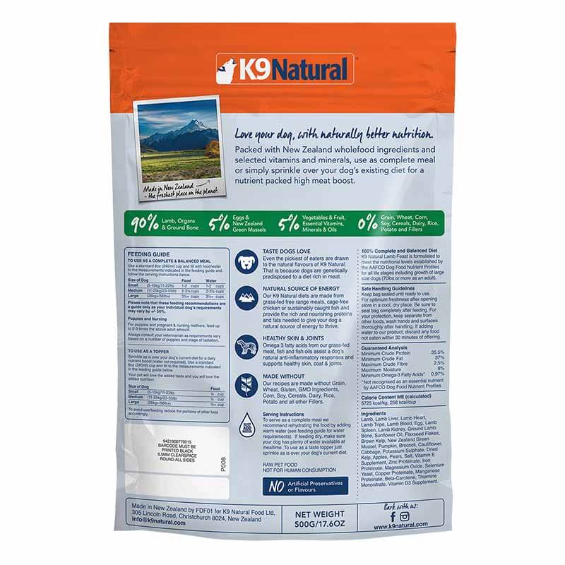 Lamb, Lamb Liver, Lamb Heart, Lamb Tripe, Lamb Blood, *Eggs, Lamb Spleen, Lamb Kidney, Ground Lamb Bone, Sunflower Oil, Flaxseed Flakes, Brown Kelp, New Zealand Green Mussel, Pumpkin, Broccoli, Cauliflower, Cabbage, Potassium Sulphate, Dried Kelp, Apples, Pears, Salt, Vitamin E Supplement, Zinc Proteinate, Iron Proteinate, Magnesium Oxide, Selenium Yeast, Copper Proteinate, Manganese Proteinate, Beta-Carotene, Thiamine Mononitrate, Vitamin D3 Supplement.