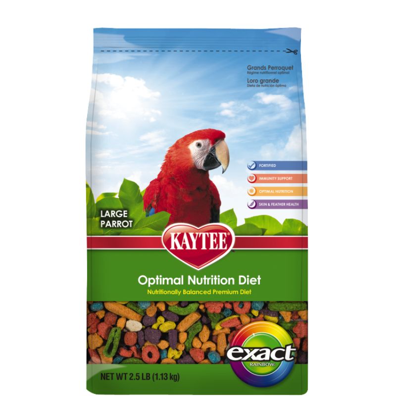 Feed your large Parrot a diet that is healthy and fun to eat with Kaytee Exact Rainbow Large Parrot Bird Food. Parrots are intelligent and curious birds. They love variety in their diet and will sort or even play with food that has different shapes and colors. Kaytee Exact Rainbow Large Parrot Bird Food combines your bird’s favorite ingredients including corn, wheat, oats, and egg with fun shapes, colors, and flavors. Each uniquely shaped bite is designed to mentally stimulate your bird and provide superior nutrition for better, brighter feathers and overall health. And unlike seed, there are no shells or hulls which means less mess in and around the cage.