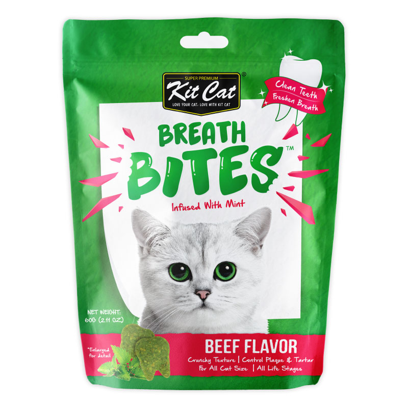 Cleaning your cat’s teeth has never been easier or more delicious with Kit Cat Breath Bites. Bursting with the tasty flavors your cat will love, these crunchy treats are specially designed to help keep your cat’s teeth clean by reducing plaque and tartar when fed daily.