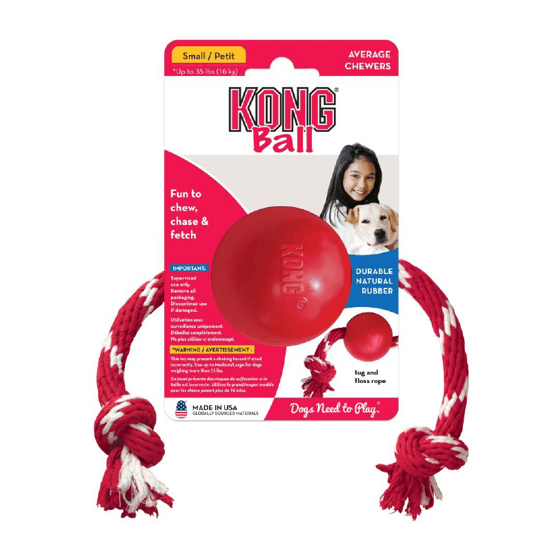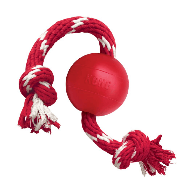 The KONG Ball with Rope is a durable interactive dog toy for fetching. The rope makes game of fetch easy and fun, and it can also be used for fun games of tug.