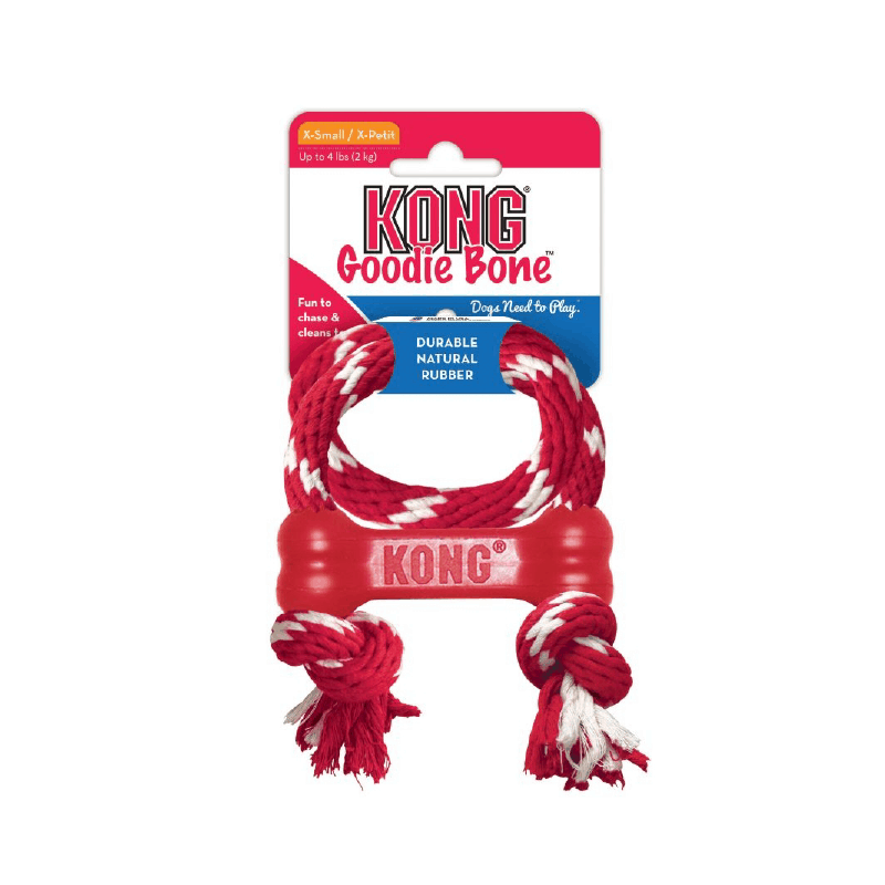 The KONG Goodie Bone™ with Rope toy engages dogs that delight in chew sessions, while the all-natural cotton rope making it an ideal toy to fulfill a dog’s instinctual needs. Made from the KONG Classic unique all-natural red rubber formula, this bone also has the added delight of an all-cotton rope that gives dogs multiple chewing choices.
