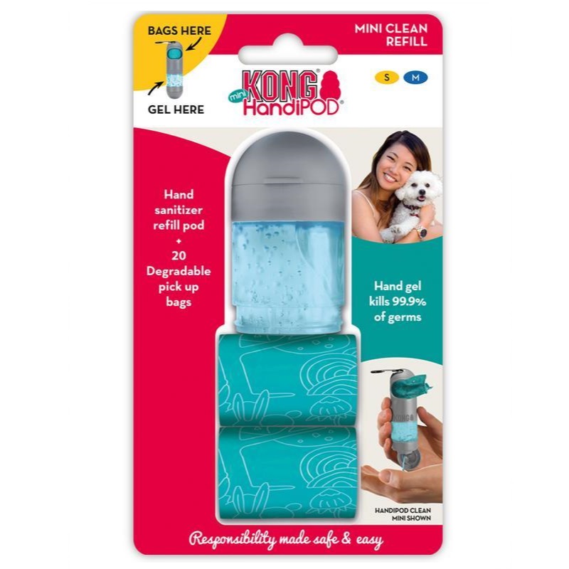 The KONG HandiPOD MINI CLEAN REFILL pack contains a hand sanitizing gel pod and two rolls of poo bags that are suitable to refill KONG HandiPOD MINI products. The hand gel is independently proven effective against germs, leaving hands feeling clean and refreshed with no sticky residue. The bags are degradable and very high quality. They are suitable for small to medium sized dogs and offer a discrete sized poo bag option.