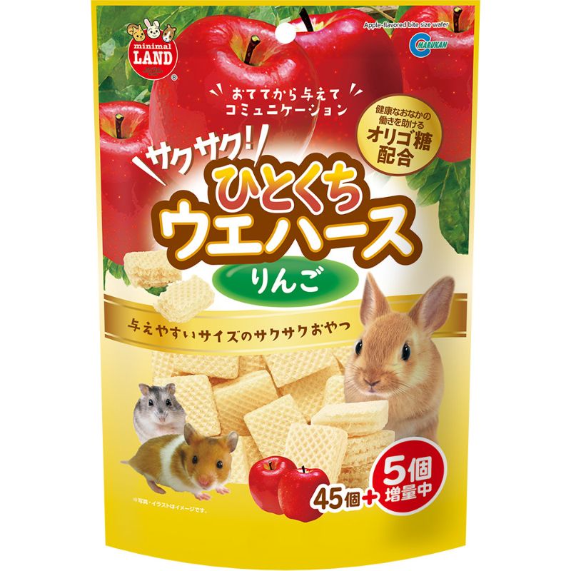 Marukan crispy bite-size apple flavor wafer treats for small animals. The compact size makes it convenient to give as a reward to your pets. Contains oligosaccharides that help work in a healthy stomach.