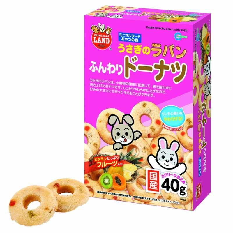 Snack baked without using eggs,considering the health of small animals. It is soft donut baked fruits,grain fermentation extract increases the intestinal good bacteria, fecal odor is reduced.