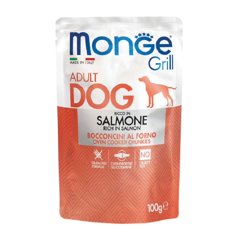 Monge Grill Pouch Salmon is the latest premium line of dog food developed by Monge in Italy. There are a variety of 6 different recipes available, where the ingredients are specially selected and grilled to perfection.