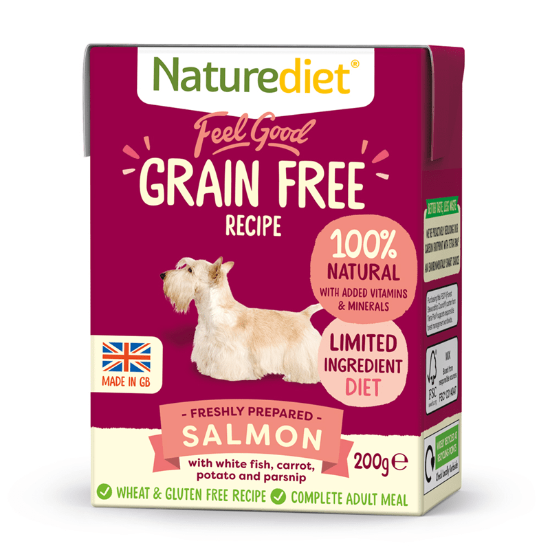 Feel Good Grain Free Salmon is rich in Omega 3 fatty acids, and is perfect for improving skin and coat quality. This grain and gluten free recipe is a nutritionally balanced, complete meal that is made using sustainably sourced Salmon and White Fish, combined with a selection of wholesome root vegetables. Steam cooked to retain its natural flavours and nutrients this complete meal contains all of the essential vitamins and minerals your dog needs for a healthy diet. Suitable for all breeds of adult and senior dogs, as well as puppies over 6 months old. 200g is ideal as a daily feed for toy and small breed dogs or the perfect portion for a treat filler.