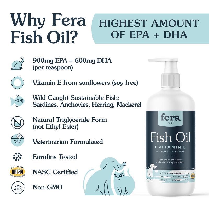 Give your buddy an overall boost with Fera Pet Organics Fish Oil  + Vitamin E Dog Supplement. This fish oil contains rich nutrients in its natural triglyceride form and is made with wild-caught sardines, anchovies, herring, and mackerel from Icelandic waters. It provides nutritional support for joint strength and flexibility while promoting heart function and normal circulation. This oil also supports a healthy immune system in your dog and brain health. With high amounts of EPA and DHA, Fera Pet Organics Fish Oil with non-GMO Vitamin E will keep your pup going strong with ingredients pet parents can trust.