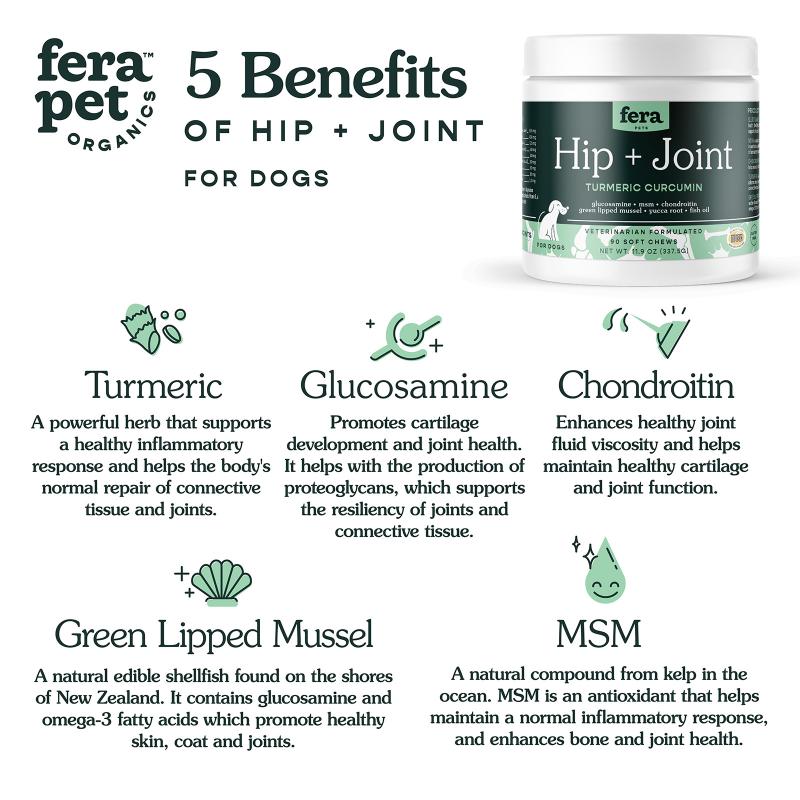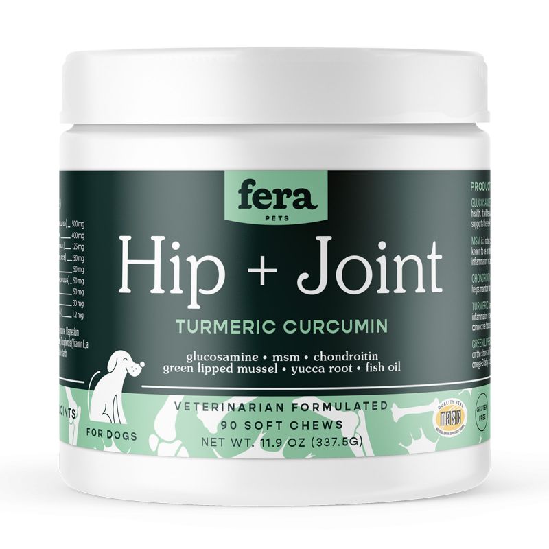 Help keep your dog playing comfortably with the Fera Pet Organics Hip & Joint Soft Chew Dog Supplement. This maximum strength supplement contains a veterinarian-formulated blend of holistic and organic ingredients that support bone and joint health, and help boost joint function in dogs of all sizes. Every soft chew is packed with glucosamine, MSM, chondroitin, and green-lipped mussel to promote healthy cartilage and joints, and turmeric for powerful anti-inflammatory action. They’re great for elderly pups, canine athletes, or any pooch that needs the extra joint-nourishing boost. Plus, your buddy will think you’re giving him a treat, since the soft chews are made with real chicken liver for the flavor dogs find irresistible. And there’s zero gluten, fillers, or anything artificial so you can feel good about giving them every day.